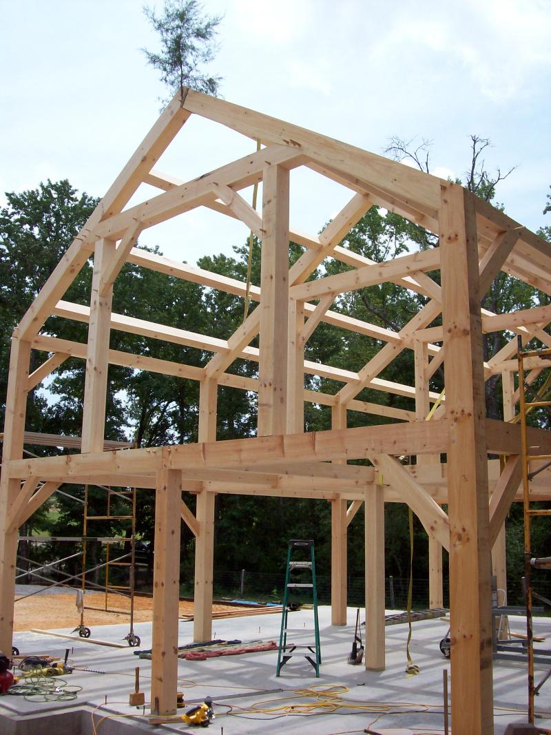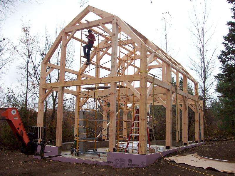We offer handcrafted timber frames using traditional mortise and tenon joinery with 1" oak pegs. We work with a timber frame designer that creates the frame in 3d drawings for your approval before your frame is cut. Planed and sanded white pine timber frames start at $20 per sq. ft. and $19per sq. ft. for graded, planed and sanded white pine. Planed douglas fir frames start at $30 per sq. ft. We offer frame raising services and we can also cover your frame with SIPs (structural insulated panels). We also can provide timber frame kits for the do it yourself types.